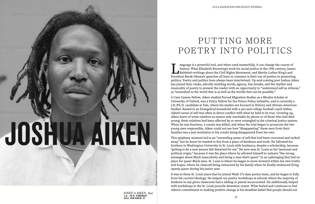 “Putting More Poetry Into Politics” is a profile of Joshua as the featured poet in the Fall/Winter issue of the UCLA Journal for Radiation Oncology (Nov. 2023), which describes the chapbook as “21 stunning poems that comprise [his] debut are vital to both poetry and politics. His poems do not shy away from loss, but they also do not dwell there. From the parable-like “As the Prairie Burns” to the 3-poem series, “Leftovers,” Aiken invites the reader to explore with him what love and loss and freedom could mean…He is choosing not to disappear or be disappeared. He is choosing to never judge another on the worst thing they’ve done. He is inviting us to join him. And this is precisely why you’ll be hearing about and reading work from Joshua Aiken for decades to come.“